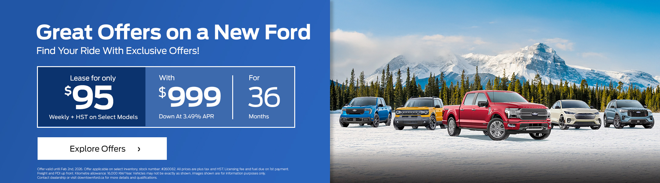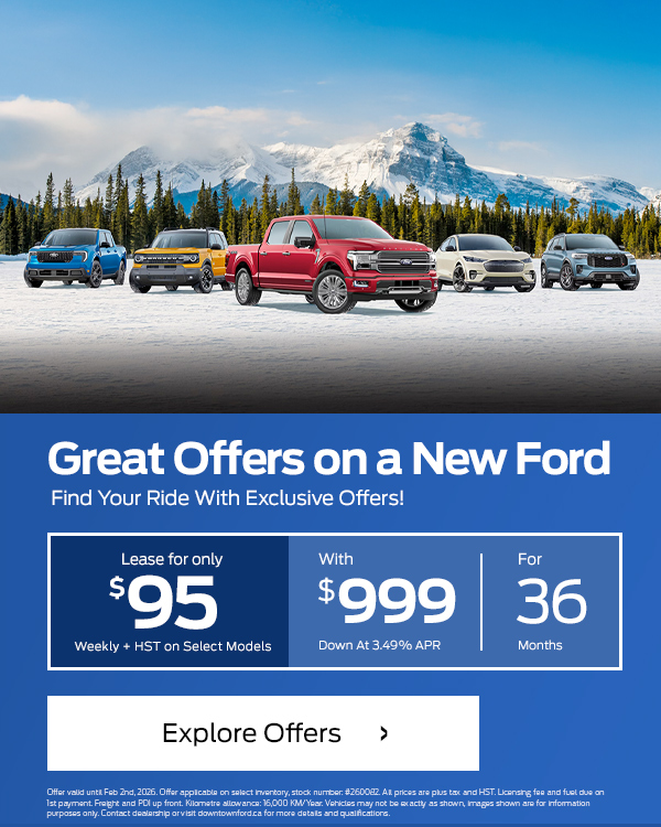 Disclaimer : Finance and Lease offers on approved credit. Regional offers, lease and finance conditions apply. See your local Ford dealer for more information. Use of any calculation and/or tools on https://www.downtownford.ca does not constitute an offer of direct financing or any particular lease, finance, purchase option or transaction. Calculation and tools are intended for illustrative purposes only. Rates and requirements may vary depending on credit worthiness. Every effort is made to ensure the accuracy of the content on the pages on https://www.downtownford.ca. In the event of a discrepancy, error or omission, vehicle prices, offers and features as established by Ford Canada and participating Ford dealers in Canada, will prevail.